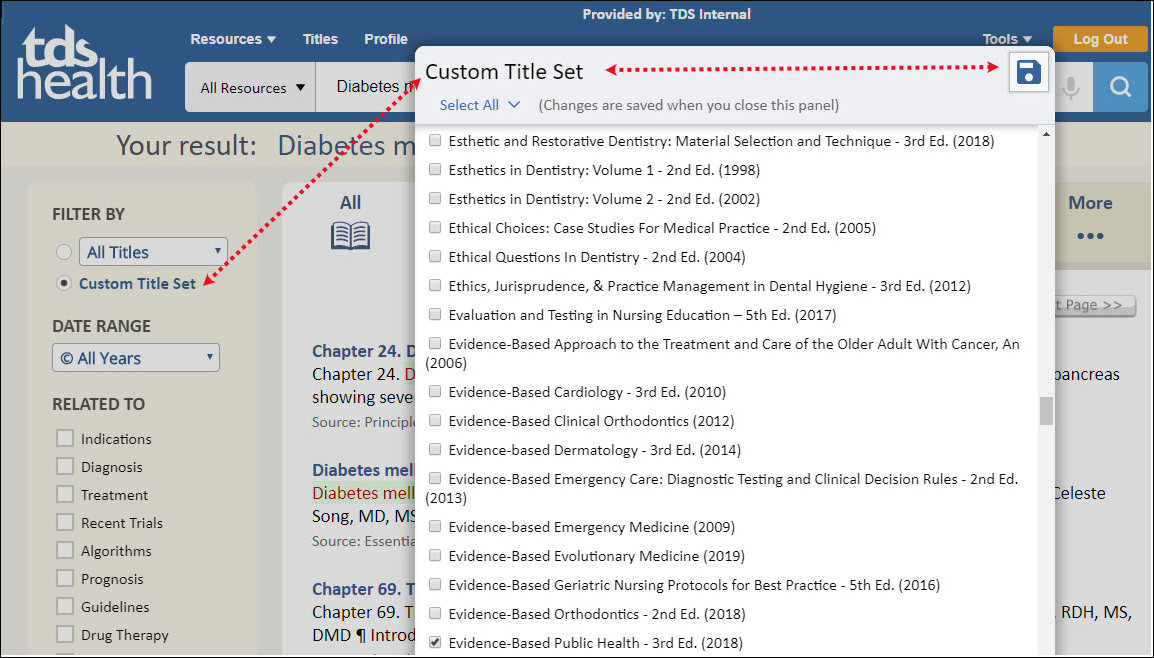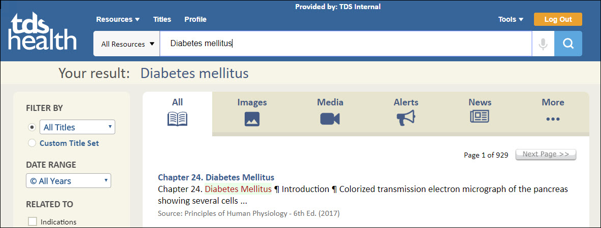 All of the content within your STAT!Ref library subscription is indexed and fully searchable. An All Search is the default setting meaning that every title, image/media, alerts, additional resources etc. is returned to you upon your initial search and all are available for access from the Result page. TDS Health offers multiple filters on the Results page to further refine and categorize search results. The default settings for an initial search are, FILTER BY: All Titles; DATE RANGE: All Years; RELATED TO: None of the options are pre-selected; ADVANCED SEARCH: Suffixes.