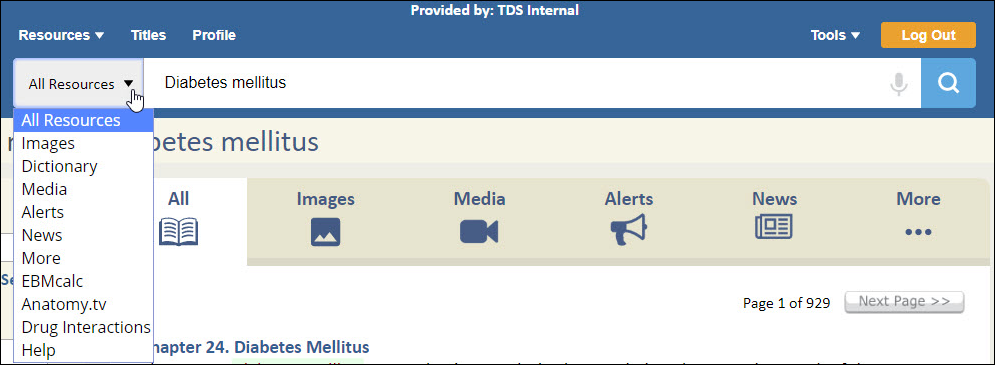 In addition to the tabs as explained previously, the Search Bar also has a search drop-down menu. You can use the drop-menu from any page to quickly access any of the many resources available to you.