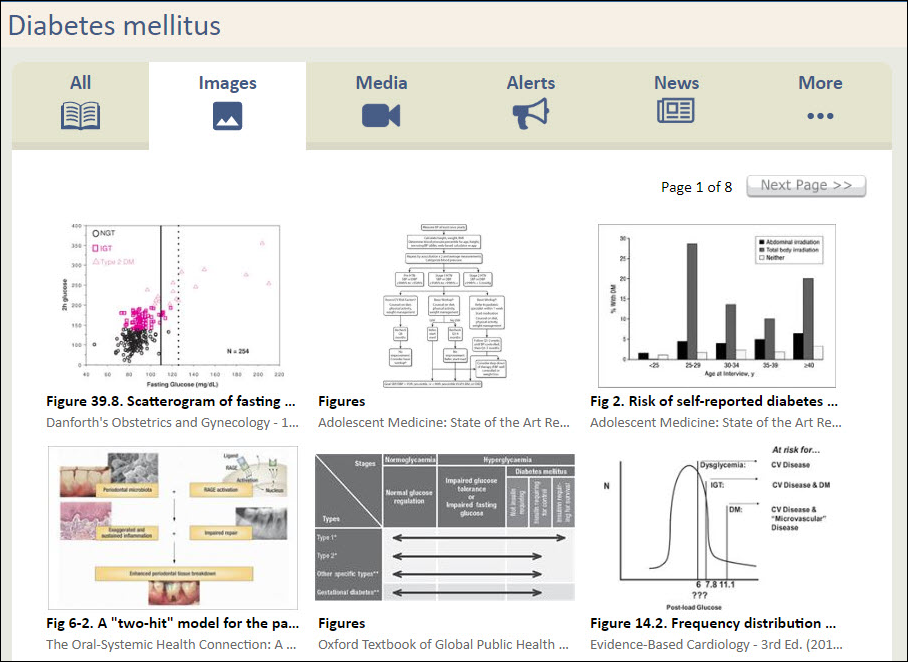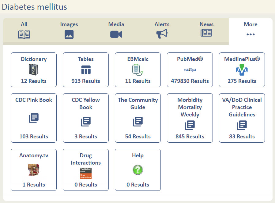 5) More... - A variety of additional resource search results, including: term definitions; Tables (columnar data documents); EBMCalc; PubMed; MedlinePlus; CDC Pink Book; CDC Yellow Book; CDC's the Community Guide; CDC's Morbidity Mortality Weekly; Practice Guidelines; The Medical Letter's Adverse Drug Interactions; and TDS Health Help files.